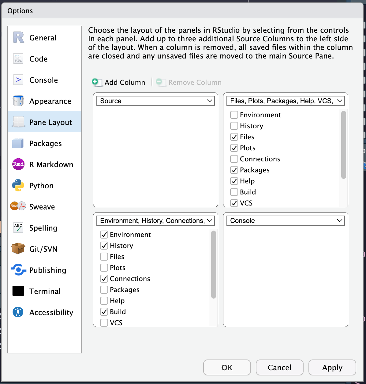 RStudio pane layout settings